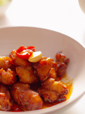 Soczysty kurczak w aromatycznym sosie sojowym, doprawiony przyprawami charakterystycznymi dla kuchni chińskiej.