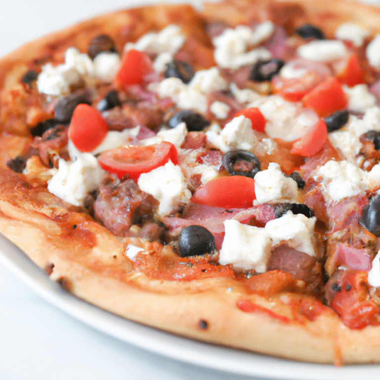 Przepis na pyszną, domową pizzę po grecku, z oliwkami, fetą i świeżymi warzywami.