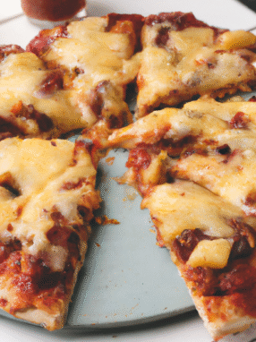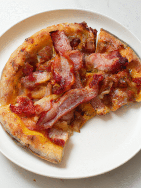 Domowa pizza z chrupiącym boczkiem i soczystym sosem pomidorowym. Idealna na wieczór z filmem lub spotkanie ze znajomymi.