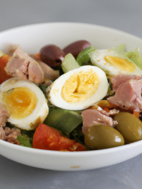 Klasyczna francuska sałatka Nicejska z tuńczykiem, jajkami, oliwkami i anchois. Idealna na lekki obiad lub kolację.
