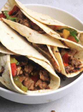 Tradycyjne meksykańskie danie składające się z grillowanej wołowiny, papryki i cebuli podawane na ciepłych tortillach. Doskonałe na obiad lub imprezę.