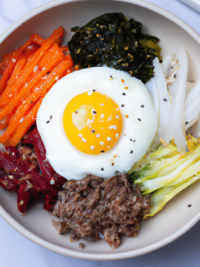 Koreańskie danie składające się z ryżu, różnorodnych warzyw, jajka sadzonego i opcjonalnie mięsa. Podawane z sosem gochujang.